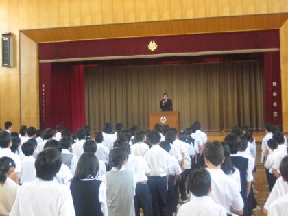 校長先生からは、4月から半年が過ぎところで、これからの学校生活についてのお話しがありました。3年生には、中学校生活も残り半年になり、悔いの残らないように行事にも進路にもしっかり取り組んでほしいと話されました。2年生には、生徒会役員選挙も終わり、2年生が生徒会だけでなくさまざまな面で学校の中心になって活躍してほしいこと、そして1年生には、小学生の気分がまだ抜けていない面があるので、中学生としての自覚をもってほしいと話されました。