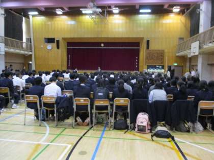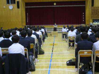 全校生徒が体育館に集まって全体学活です。生活指導主任の先生に続いて、学発実行委員長から全校生徒に話がありました。明日は一人ひとりの心に残る、素晴らしい学芸発表会にしましょう。