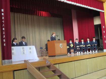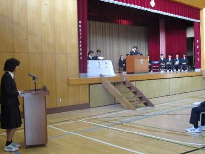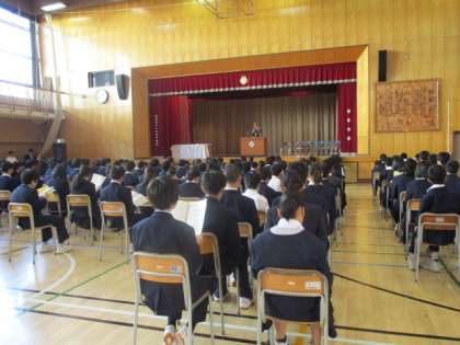 31日5校時、「後期生徒総会」が行われました。生徒会本部役員や各委員会から後期の活動方針、活動内容、生徒への要望などの説明がありました。その後質疑応答を経て、拍手で承認されました。