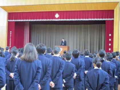校長先生からは、これからの進路選択に向けての三年生が頑張っている様子。12月の人権週間について「思いやりの心」や「かけがえのない命の尊さ」について考えていこうとのお話しがありました。さらに、12月の「人格の完成を目指して」のテーマは学校独自目標である「決意」の紹介がありました。