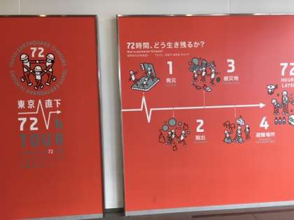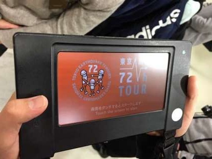 防災学習ゾーンの見学の後「東京直下72h」ツアーに挑戦しました。タブレットを使い被災直後の町で72時間をどう乗り切るのかクイズに答えながら体験しました。