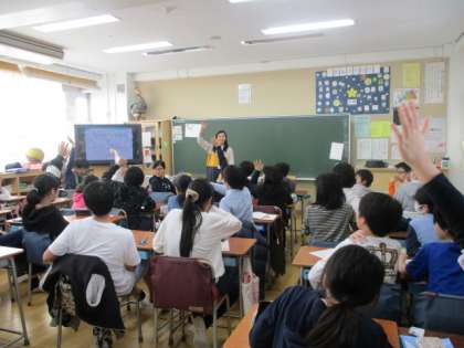 小学校と中学校の先生が一緒の教室に入り「数学って何?」をテーマに、グラフなどを用いて中学校に入学して学んでいく内容などを教えました。