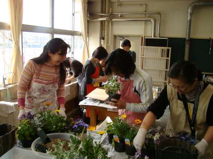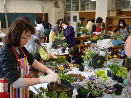 2月5日、第25回花づくりサークルが行われ、講師の門川洋子さんをお迎えして、ハンギングバスケットをつくりました。このハンギングバスケットは、毎年立青式の壇上を飾ってくれます。作業する部屋は、花の香りと、地域・保護者のみなさんの笑顔でいっぱいになりました。