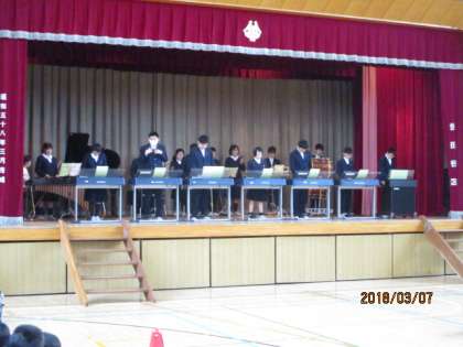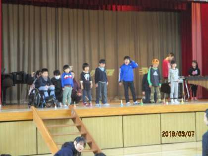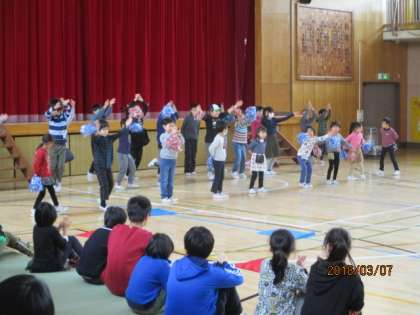あいにくの天気でしたが、四校交流会が八幡中学校体育館で行われました。奥沢小学校、尾山台小学校、桜町小学校の児童の皆さんと交流しました。八幡中、奥沢小、桜町小の出し物の様子です。