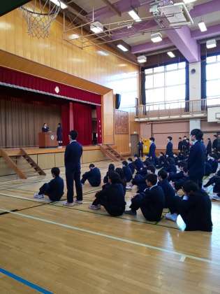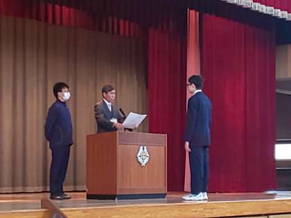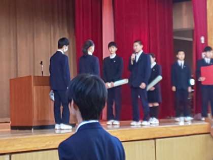 今年度最後の生徒朝礼が行われました。各委員会から年間を通して優秀な生徒の表彰とともに、三年生から一、二年生へのメッセージが送られました。