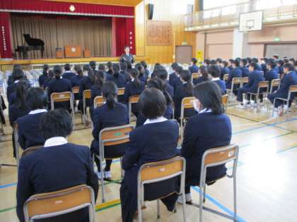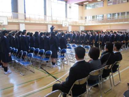 20日(水)の卒業式を前に、卒業式の予行が行われました。一連の流れを確認するとともに、証書授与や合唱の練習、起立・礼のタイミングを司会に合わせて実際にやって確認をしました。生徒は厳粛な雰囲気を感じつつ整然と実施することができました。