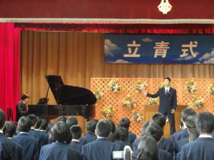 立青式は、立春の日を期して、14歳を迎える2年生の前途を祝し、激励する会として、昭和44年から開かれています。今のような意見発表の形式になったのは、平成11年のようで、本校独自の伝統ある行事です。