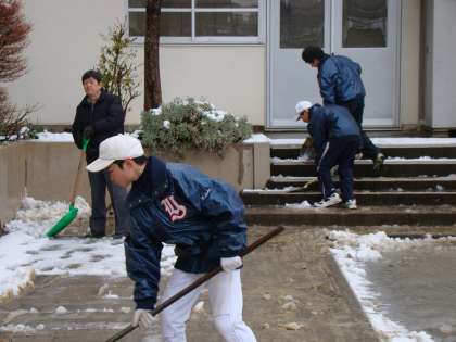週末の雪で、本校も雪が積もりました。この日(15日)、朝練ができなかった野球部員は率先して雪かきをしてくれました。主事さん方も朝早くより雪かきをしてくれ、生徒登校時間には、安全に通れるようになっていました。