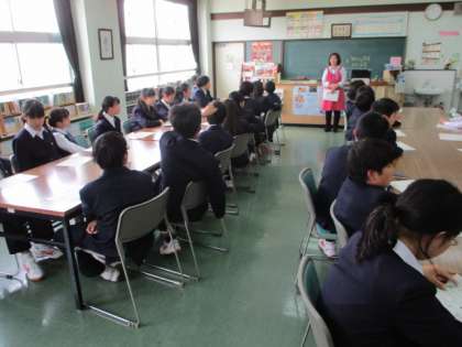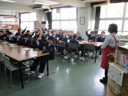 図書館司書の先生から、八幡中学校の図書室の蔵書数や図書室の利用の仕方、日本十進分類法のことなどを学びました。たくさん本を読んで様々なことを知ってほしいと思います。