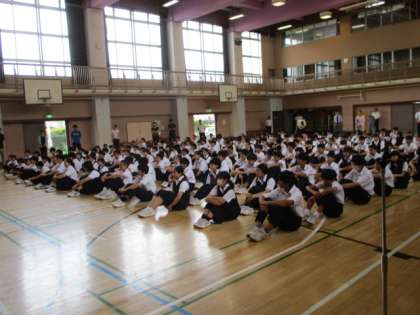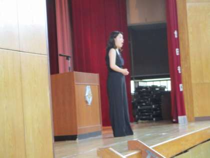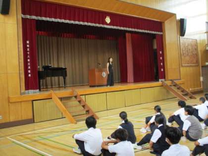 生徒朝礼の後、先週までの3週間教育実習で音楽を担当していた実習生があいさつに来ました。大学で声楽を専門に学んでいて、素晴らしい歌声を披露していただきました。