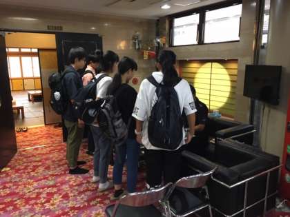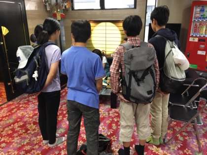 さあ、いよいよ班行動の始まりです。出発前に必要な物を受け取り、チェックを受けています。
