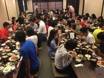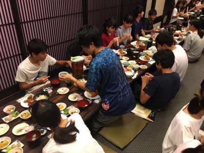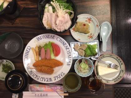 2日目の夕食です。メニューは「ごはん、白身魚のフライ、串カツ、ウインナー、ポテトフライ、生野菜、ロールキャベツ、うどんすき、中華春雨、シュウマイ、カッパ漬け、りんごゼリー、チーズケーキ」です。お腹いっぱいになりました。