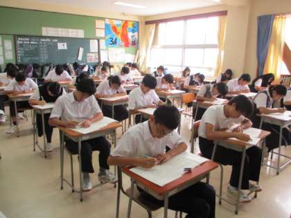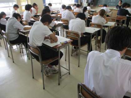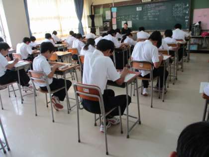 28日、1学期期末考査最終日。最後まで全力で試験問題に取り組んでいました。返却されたら間違えたところを復習して着実に理解できるように努力してください。