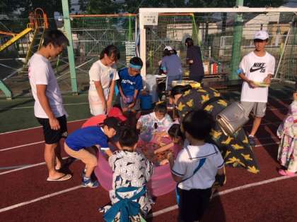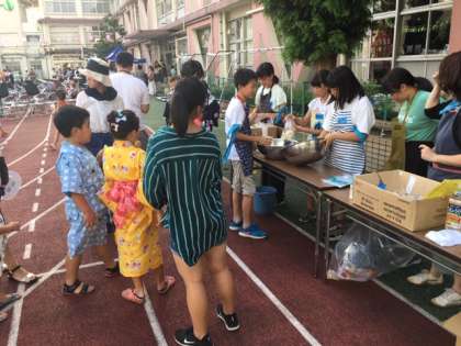 7月27日、八幡小学校を会場にして「親子盆踊り大会」が開かれました。午前中から多くの生徒がボランティアで活躍してくれました。