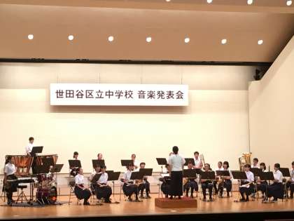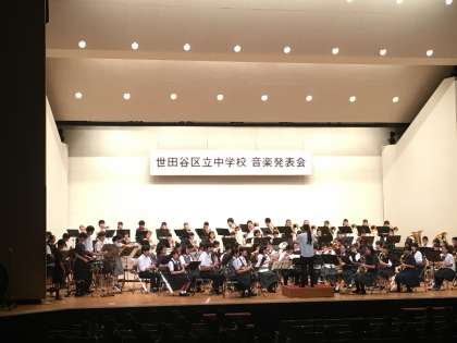 29日午後、世田谷区民会館ホールで「音楽発表会」が行われました。八幡中学校吹奏楽部は「Celebration for Winds and Percussion」を演奏しました。夏休み中の練習の成果が発揮された素晴らしい演奏でした。最後は、3年生有志による合同演奏が行われました。
