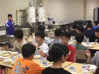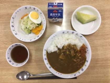 6時から夕食です。メニューは「カレーライス、福神漬け、牛乳、盛合せサラダ、メロン」です。たくさん食べました。