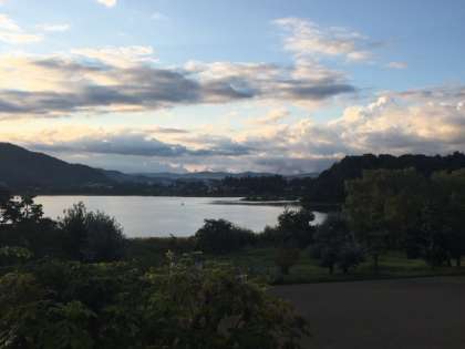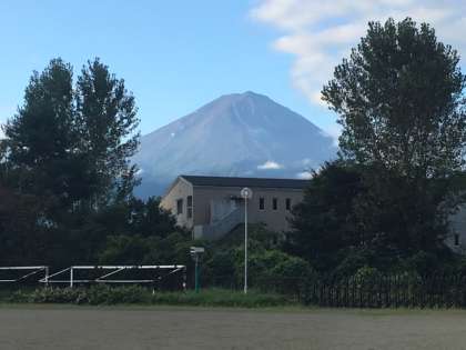 河口湖移動教室2日目の朝を迎えました。今日も良い天気に恵まれています。学園から河口湖や富士山が美しく見えています。