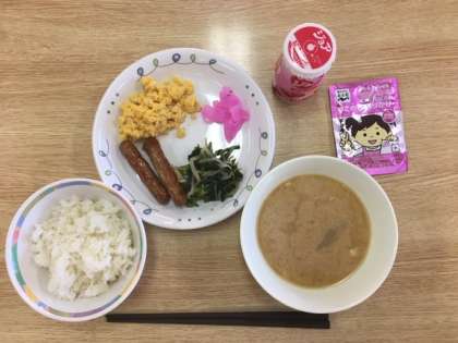 2日目の朝食です。今日の活動に備えてしっかり食べましょう。メニューは「ごはん、ふりかけ、炒り卵、ほうれん草のおひたし、豚汁、つけもの、ジョア」です。