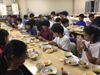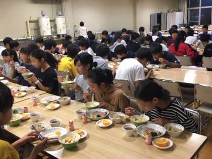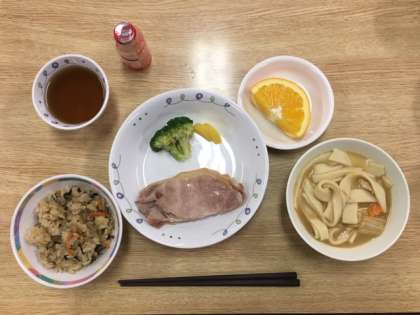 2日目の夕食です。メニューは「炊き込みご飯、ほうとう、豚ロースのソテー、茹で野菜、漬物、オレンジ、ヤクルト」でした。