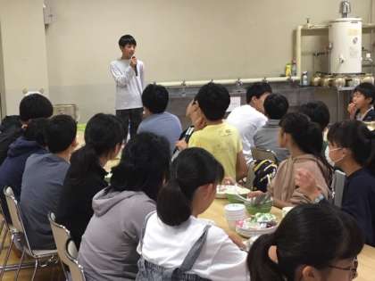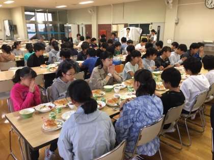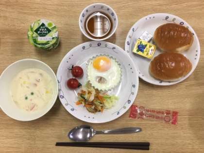 最終日の朝食です。メニューは「パン(バター、ブルーベリージャム)、ベーコンエッグ、野菜サラダ、コーンスープ、アロエヨーグルト」です。学園での最後の食事。感謝しながら食べました。