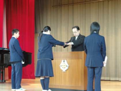 終了式では各学年とC組の代表の生徒が壇上に上がり、校長先生から通知表を受け取りました。