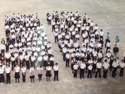 18日朝、70周年記念誌用の全校写真を撮りました。雨が降る前に撮ることができました。