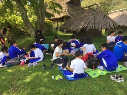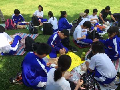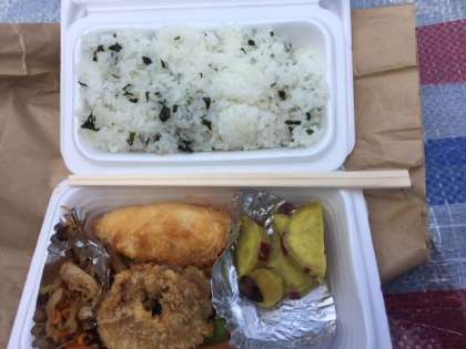 記念撮影の後、お昼のお弁当です。メニューは「わかめごはん、魚とイカのフライ、切り干し大根、マカロニソテー、大学芋、ゆでアスパラ」です。