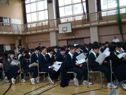 全校で、学校生活のきまりと保健室の利用の仕方について確認をしました。1年生は、小学校とは異なるきまりに戸惑うことも多いと思いますが、少しずつなれていきましょう。2・3年生にとっては、当たり前のことですが、きまりを再確認して下級生の手本となってほしいと思います。