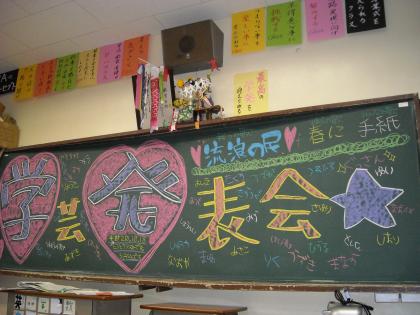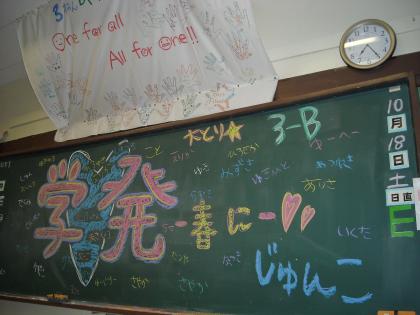 ようやく準備が終わりました。10月に入ってから生徒たちは、舞台発表の練習,展示の準備に熱心に取り組んできました。その準備も今日で終わりです。その前日準備の合間に生徒たちは、教室の黒板にメッセージを書いていました。生徒たちの気持ちが伝わってきます。