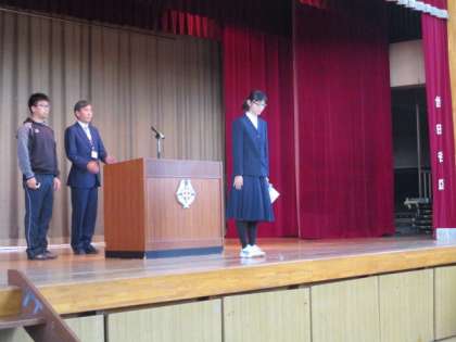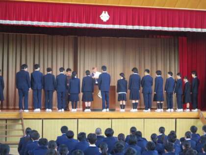 6日、11月の全校朝礼がありました。先日行われたC組の都の陸上大会の表彰とバドミントン新人戦個人の部の表彰がありました。