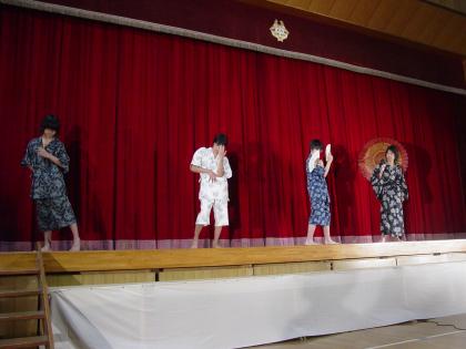 学芸発表会のプログラム第1番は3年生の選択家庭科による浴衣・甚平のファッションショーでした。4名という少人数ながら、大きな印象を残しました。甚平や浴衣などそれぞれの作品を身にまとい、颯爽と現れたのは全員男子。傘に扇子にと小道具も上手に使い、会場を盛り上げていました。来年の夏が楽しみですね。