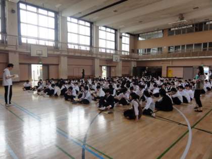 5時間目、体育館に1・2年生が集まり、河口湖移動教室にむけて合同の事前指導を行いました。