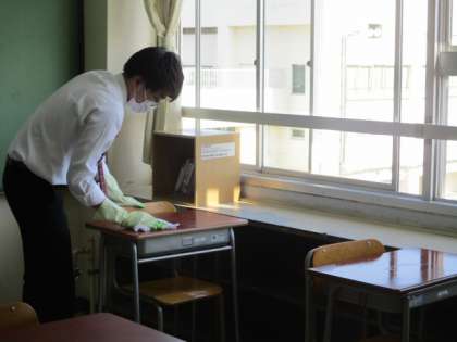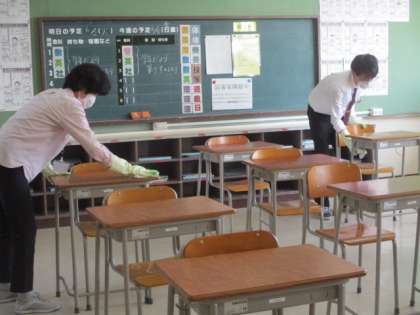 机を一つずつ消毒液で拭いています。