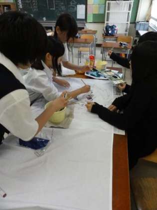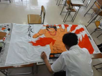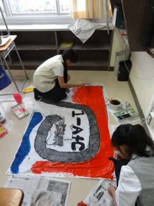 今、運動会にむけて放課後に残ってクラス旗を作成している生徒たちがいます。