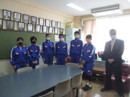 新しい生徒会役員が決まり、これまでの生徒会を支えてきた旧生徒会役員が校長先生に挨拶をしました。校長先生は生徒会役員の人たちのこれまでの功績を称えてくださり、新たな生徒会のスタートを確認しました。