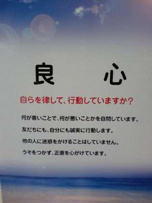 善悪の判断ができる、誠実であること、人に迷惑をかけない、正直であること、どれも人として大切なことです。自分の良心に従って、よりよい生き方を目指しましょう。
