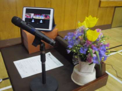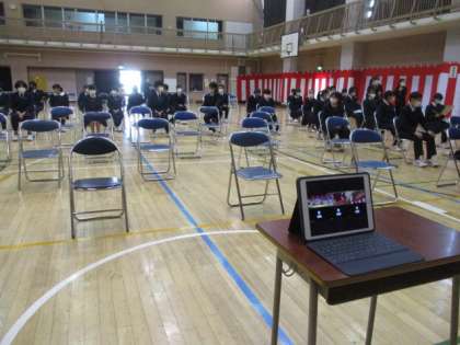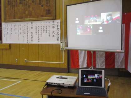 そして双方の様子が見られるように、体育館にスクリーンを設置しました。