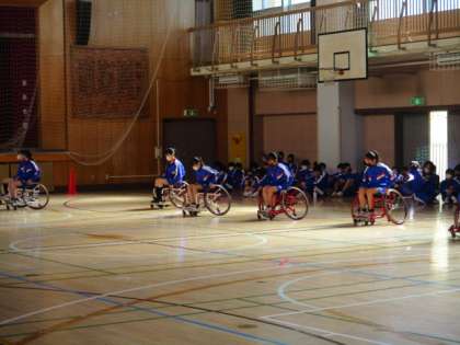 授業に参加した生徒全員に競技用の車いすに乗せてくださいました。
