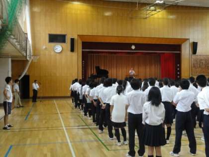 1学期もこの日で終わりです。震災の影響の中でスタートし、1・2年合同の移動教室、3年の修学旅行、そして運動会と、多くの行事を通して成長してきたと思います。校長先生からは、「夏休みにしかできないことにチャレンジしよう」「生活時程を定め学習に取り組もう」「自ら進んで手伝いをしよう」「自分の健康は自分で守ろう」というお話がありました。ぜひ、有意義な夏休みにしてください。