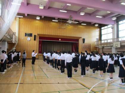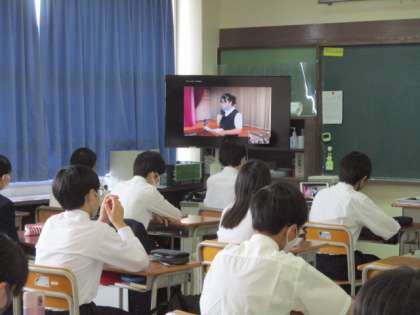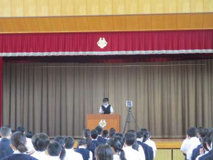 5月の生徒朝礼も感染症対策として、2年生のみ教室でのズーム参加となりました。