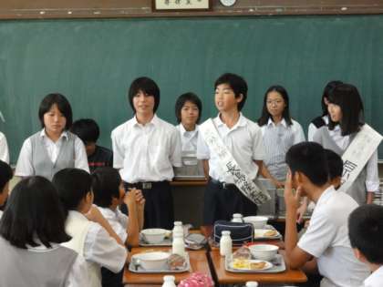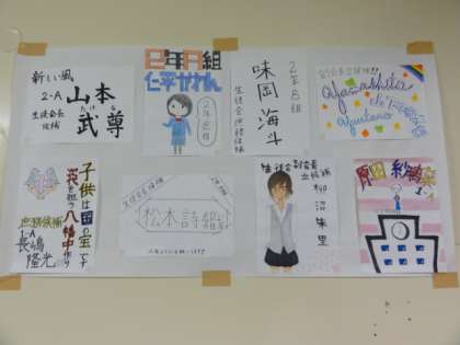 生徒昇降口などに立候補者のポスターが掲示されており、昼の給食時に各教室に回り、挨拶をしたりしています(他の生徒より早めに給食を食べています)。