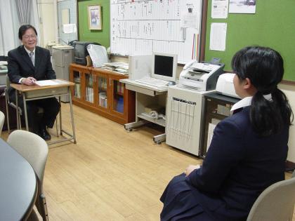 3年生全員が校長先生と15分間、入室の方法から始まり、面接での言葉遣いや服装などとともに、本番と同じように志望動機など、一人ひとり細かく丁寧に練習をしています。1月までには、全員が1度は面接練習を行います。