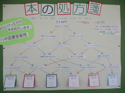 さて、ようやく本題です。旧C組の廊下の壁に掲示してある、「本の処方箋 〜あなたにぴったりの本を処方します 八中図書室薬局〜」で、AからFを選んで、図書館前と中に用意してある、本の中身が分からないようにきれいに包んだ「処方箋」を選ぶという仕組みです。数に限りがあるのでお早めに。
