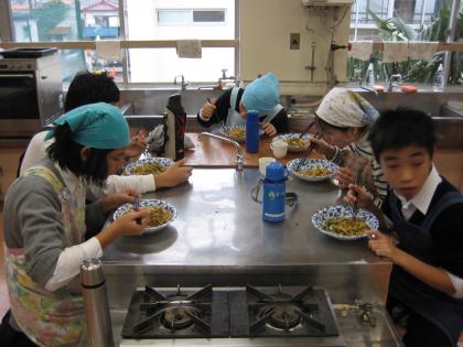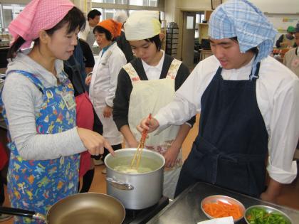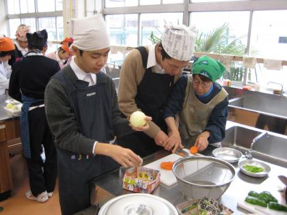 今回は、ピーマンの切り方をはじめて教わった生徒も多く、難しそうにしながらも真剣に取り組んでいました。