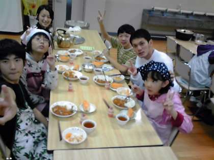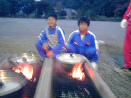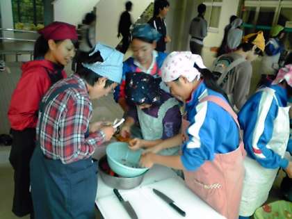 班に分かれてカレー作りです。材料を切って、かまどに火をつけ…。