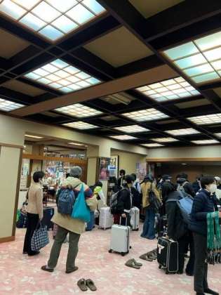 班ごとの見学を終えて宿に到着。市街から30分ほど郊外からか周りはまだ雪が厚く残っています。班行動はかなり歩きました。
