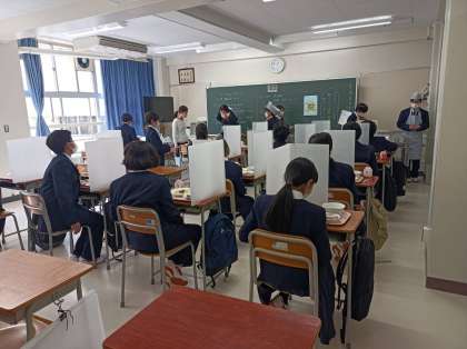 令和4年度、全校生徒が揃った八中生活初日。1年生は初給食に不慣れながらもしっかりと対応していました。