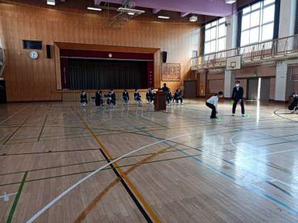 上級生が体育館から全体に向けて配信しています。