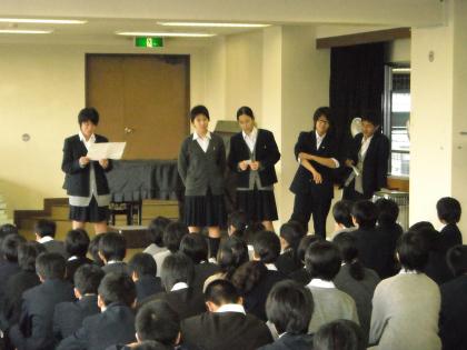いよいよ明日で2学期も終了です。今日は、全ての学年で学年集会が行われました。学級委員からの話や先生から今学期の話や冬休みの過ごし方についてのがありました。どの学年も、この2学期に良かった点や反省すべき点があったと思います。来学期に生かすためにも、あと一日しっかりとした気持ちですごしましょう。
