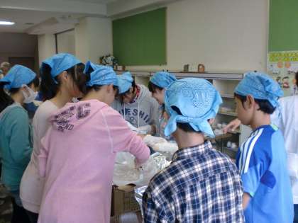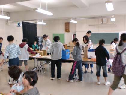 八幡中学校からは、ボランティアとして生徒が参加し、「炊き出し訓練」と「物質袋詰め訓練」にそれぞれ別れて作業しました。